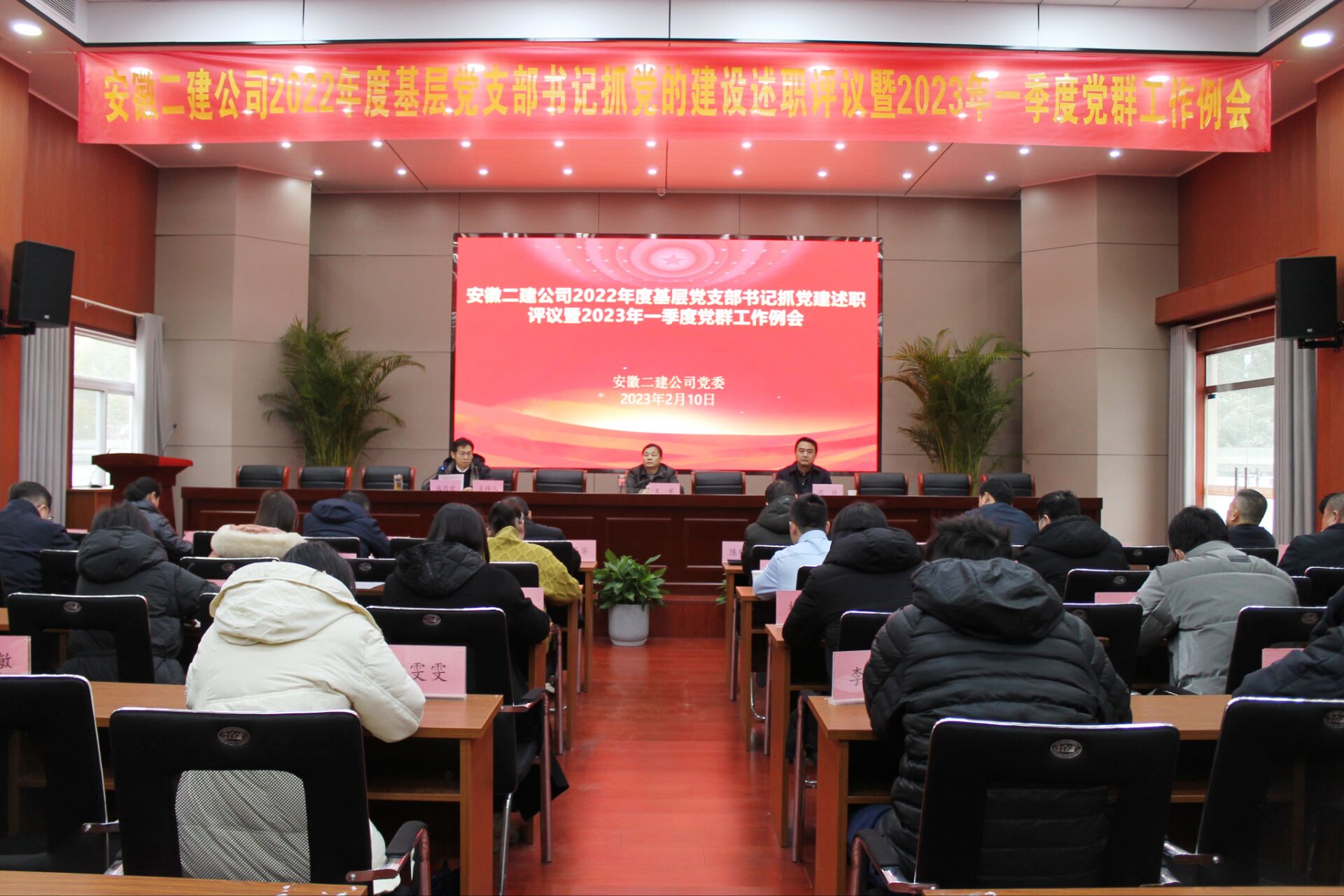 2月10日下午,安徽二建公司在新會議室召開2022年度基層黨支部書記抓黨的建設(shè)述職評議暨2023年一季度黨群工作例會。黨委副書記、工會主席王軍,黨委委員、紀(jì)委書記沈壯出席會議,黨委工作部主任施用宏主持會議。