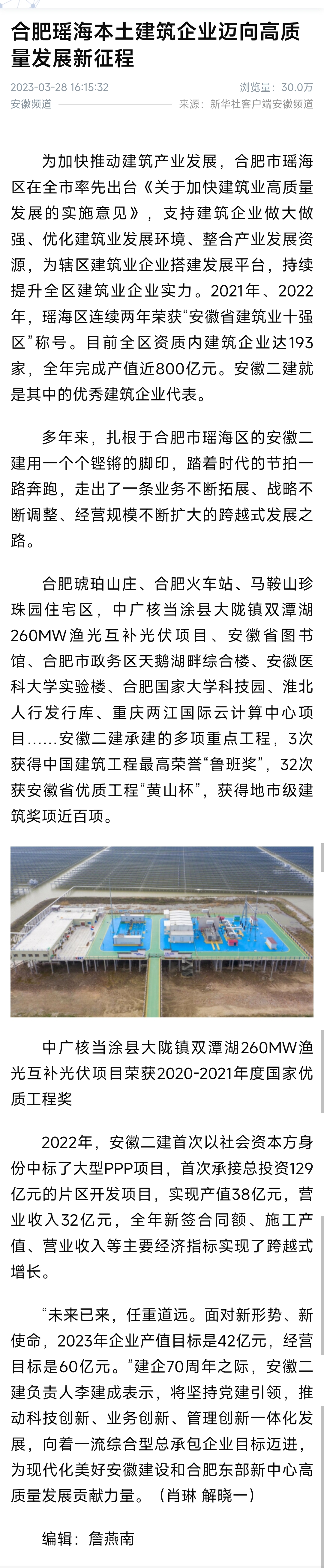 時光向前,二建向上!3月28日,自人民網(wǎng)、央廣網(wǎng)、中國網(wǎng)、中國日報網(wǎng)、安徽日報客戶端等主流媒體集中報道安徽二建七十年發(fā)展成就后,公司作為合肥瑤海本土優(yōu)秀建筑企業(yè)邁向高質(zhì)量發(fā)展新征程,首次刊登在新華社客戶端安徽頻道,一經(jīng)報道瀏覽量達30萬次。