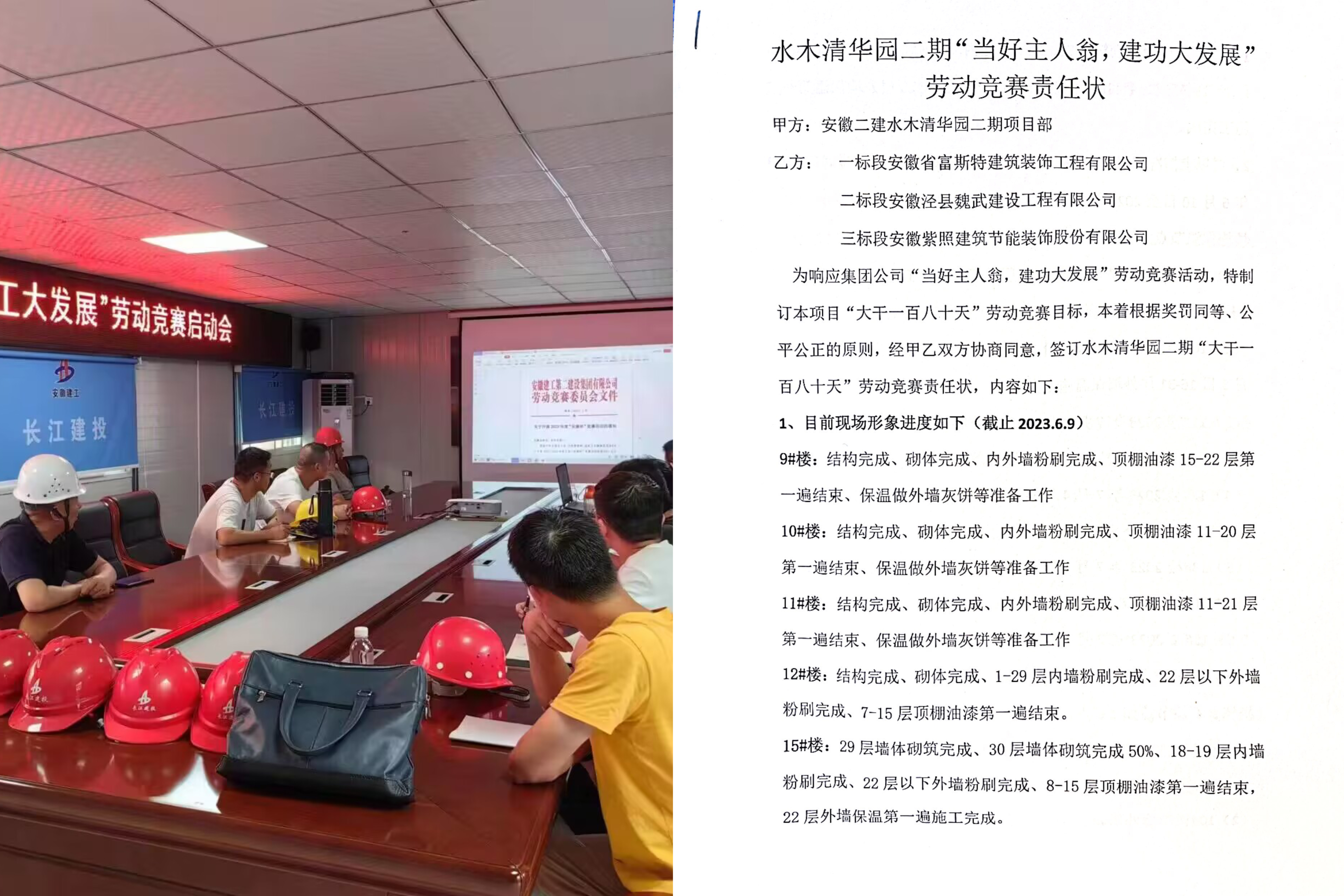 為積極響應(yīng)公司“當(dāng)好主人翁 建功大發(fā)展”勞動競賽號召,銅陵水木清華園二期項目部以“項目基礎(chǔ)管理年”活動為抓手,聚焦全年生產(chǎn)目標(biāo)任務(wù);以勞動精神為引領(lǐng),下好先手棋,打好主動仗;以提質(zhì)增效、價值創(chuàng)造為重點,不斷提升全員勞動生產(chǎn)率,形成比學(xué)趕超的濃厚氛圍,為完成勞動競賽目標(biāo)任務(wù)奠定堅實基礎(chǔ)。