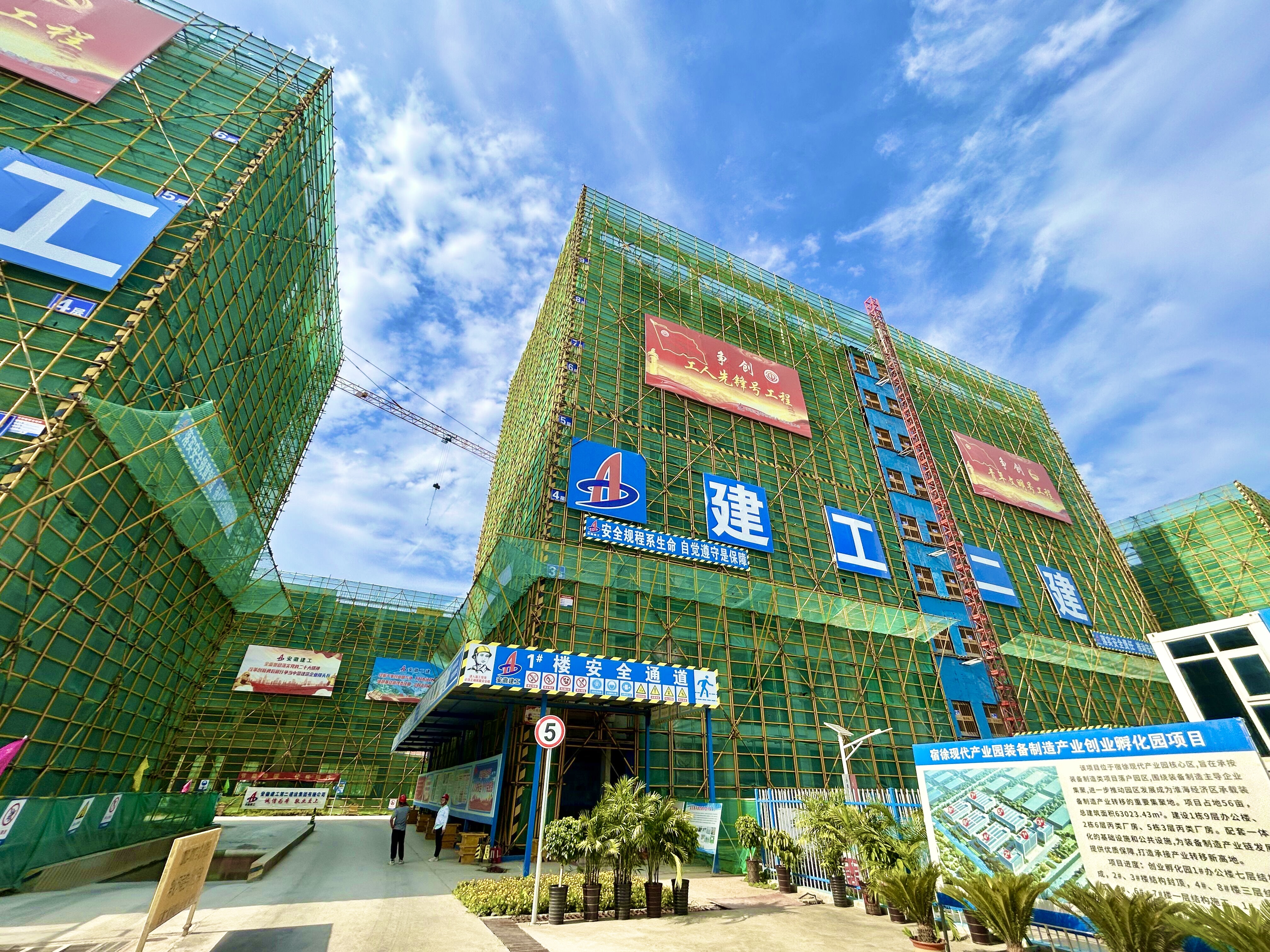 依托勞動競賽,項目部倒排工期、掛圖作戰(zhàn),加強現(xiàn)場人、機、料的投入,加大現(xiàn)場工作面建設。日前,宿徐產業(yè)園消防站及垃圾中轉站項目已竣工驗收;創(chuàng)業(yè)孵化園項目2#、3#樓主體驗收已完成;1#、4#、8#樓結構已封頂;5#、6#、7#樓正處于主體施工階段。其中,孵化園廠房更是連續(xù)通過了“宿州市建設工程施工質量標準化示范工程”“集團安全文明示范工地”以及“宿州市市級建筑施工安全生產標準化示范工地”的驗收。此外,在項目實施過程中,項目黨支部充分發(fā)揮黨組織的戰(zhàn)斗堡壘作用和黨員先鋒模范作用,順利通過驗收并被命名為建工集團“黨員先鋒號”工程。