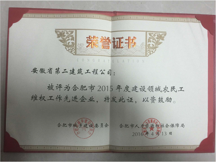 日前,在合肥市建委、合肥市人力資源和社會保障局聯(lián)合舉辦的合肥市2015年度建設領域農(nóng)民工維權(quán)先進管理單位、先進企業(yè)和先進個人的評比表彰活動中,我公司被授予“建設領域農(nóng)民工維權(quán)工作先進企業(yè)”稱號