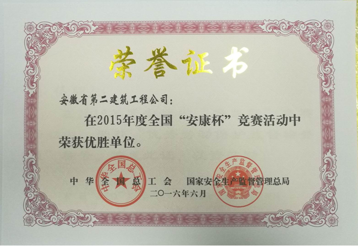 近日,安徽二建公司被評為2015年度全國“安康杯”競賽優(yōu)勝單位,并在日前召開的安徽省總工會“安康杯”競賽總結(jié)會上獲通報表彰。這是公司繼獲得2014年度安徽省“安康杯”競賽優(yōu)勝企業(yè)后再獲國家級榮譽(yù)。