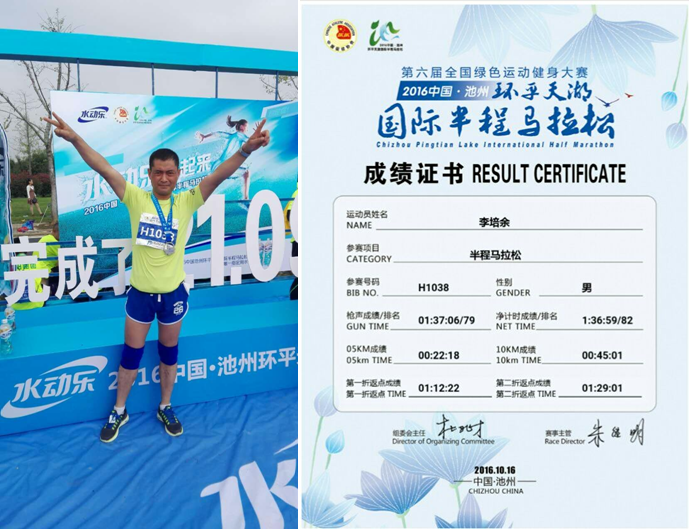 “健康跑”作為一項群眾喜聞樂見的運動項目,深得大眾喜愛。合肥也有一個人數(shù)眾多的“跑吧團”,成員以跑步結友,通過參加各類國際、國內(nèi)比賽,結識業(yè)內(nèi)高手,增進彼此友誼。李培余多年一直堅持鍛煉身體,無論寒來暑往,刮風下雨,堅持跑步從不間斷,以自己的實際行動倡導積極健康的生活方式,不僅使自己的身體素質(zhì)得到了提高,也為身邊的朋友、同事樹立了榜樣,帶動越來越多的人加入其中。李培余也因為具備較好的長跑體能,獲得過多項國際比賽的好成績。
