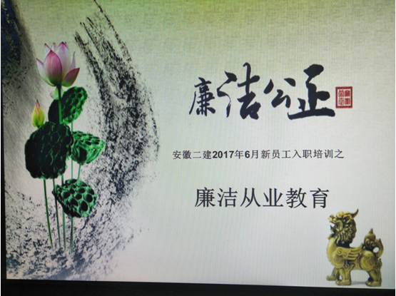 6月19日,安徽二建紀(jì)委對(duì)新入職員工進(jìn)行了崗前廉潔從業(yè)教育培訓(xùn),首次將廉潔自律作為走上新崗位的第一課,引導(dǎo)和加強(qiáng)新員工在思想上牢固樹立“廉潔從業(yè),遵紀(jì)守法”的廉潔意識(shí),提高廉潔自律的辨識(shí)能力和自我約束力。