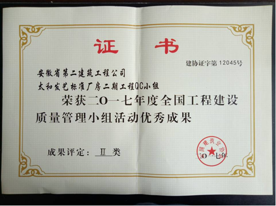 6月27—30日,安徽二建四分公司太和發(fā)藝標(biāo)準(zhǔn)廠(chǎng)房二期工程QC小組參加了由中國(guó)建筑業(yè)協(xié)會(huì)在四川成都主辦的全國(guó)工程建設(shè)優(yōu)秀質(zhì)量管理小組活動(dòng)成果交流會(huì)。經(jīng)過(guò)激烈的評(píng)比,太和發(fā)藝標(biāo)準(zhǔn)廠(chǎng)房二期工程QC小組《提高混凝土框架柱觀感質(zhì)量合格率》憑借著“高標(biāo)準(zhǔn)、嚴(yán)要求”的技術(shù)管控榮獲2017年度全國(guó)工程建設(shè)優(yōu)秀QC成果二等獎(jiǎng)。