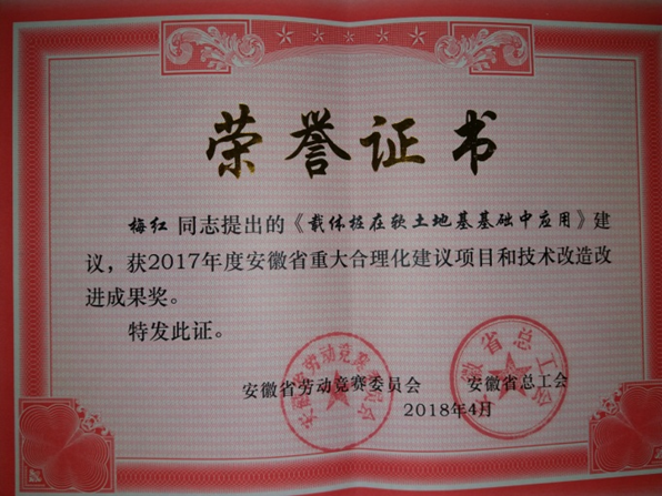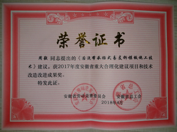 在日前召開的安徽省慶?!拔逡弧濒摺爱?dāng)好主人翁、建功新時(shí)代”勞動競賽推進(jìn)大會上,對獲得榮譽(yù)稱號的先進(jìn)集體和先進(jìn)個(gè)人進(jìn)行了表彰頒獎(jiǎng)。我公司技術(shù)質(zhì)量部主任周毅提出的《后澆帶承插式易支拆模板施工技術(shù)》和副主任梅紅提出的《載體樁在軟土地基基礎(chǔ)中應(yīng)用》建議,雙雙榮獲2017年度安徽省重大合理化建議項(xiàng)目和技術(shù)改造改進(jìn)成果獎(jiǎng)。