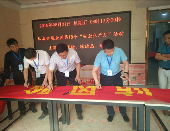 2019年5月31日,公司安全管理部、工會在公司大院舉行了全國第十八個“安全生產月”活動啟動儀式,公司機關全體職工參加??偨浝黻懬诒笞鲉又v話,指出安全生產工作的重要性和“安全生產月”活動的意義。分管安全副總經理葉和永帶領全體職工進行了安全宣誓,隨后,在印有“安全生產月”主題“防風險 除隱患 遏事故”的橫幅上簽名。