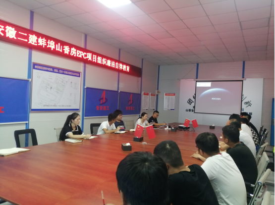 8月11日中午,一分公司黨支部書記倪海霞在蚌埠山香安置房EPC項目部開展廉潔從業(yè)教育,強調(diào)作風(fēng)建設(shè)的重要性,組織全體職工學(xué)習(xí)《工程建設(shè)領(lǐng)域廉潔風(fēng)險防控清單》。
