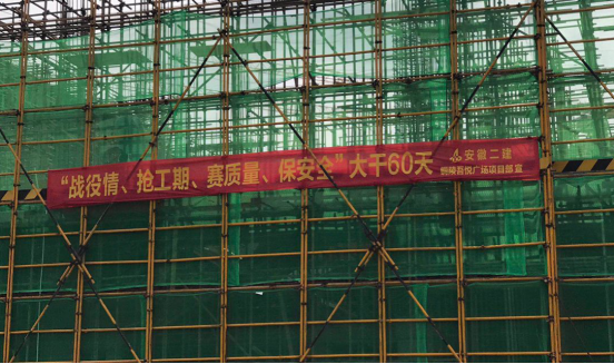 銅陵吾悅廣場(chǎng)項(xiàng)目計(jì)劃完成競(jìng)賽產(chǎn)值6000萬(wàn),為保證該目標(biāo)的完成,項(xiàng)目負(fù)責(zé)人與勞務(wù)班組簽訂勞動(dòng)競(jìng)賽責(zé)任狀,對(duì)表現(xiàn)優(yōu)異的班組予以獎(jiǎng)勵(lì),現(xiàn)場(chǎng)懸掛各類條幅宣傳大干60天勞動(dòng)競(jìng)賽精神。