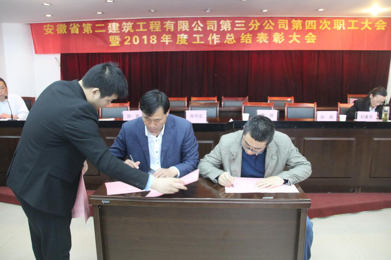 會上,公司黨委工作部對分公司領(lǐng)導(dǎo)班子及班子成員進行民主測評,對后備干部進行民主推薦;馬福才經(jīng)理和各項目經(jīng)理簽訂《目標(biāo)責(zé)任狀》、《勞動競賽責(zé)任狀》,為各責(zé)任主體完成全年指標(biāo)下達(dá)了“任務(wù)書”、確立了考核依據(jù);對過去一年在各自崗位上作出突出貢獻的先進科室、項目及個人進行表彰,更好地發(fā)揮了榜樣引領(lǐng)作用,促進形成崇尚先進、學(xué)習(xí)先進、爭當(dāng)先進的良好氛圍。
