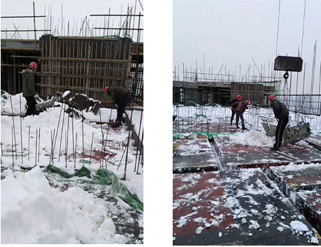 隨著“大干60天生產(chǎn)競賽”的圓滿結(jié)束,宿州市于元月4日迎來了第一場大范圍強降雪。持續(xù)了兩天的大雪使整個宿州籠罩在一片白色之中,道路全部被阻斷,現(xiàn)場施工也一度停滯。為做好極端天氣下建筑施工的安全生產(chǎn)工作,一方面項目部緊急成立應(yīng)急小組,對暴雪造成的安全隱患進(jìn)行全面排查,尤其對生活區(qū)、樓層外架、現(xiàn)場臨時用電、起重設(shè)備等進(jìn)行專項檢查,及時清理積雪、消除隱患;另一方面為保證雪后施工的正常開展,項目部動員管理人員對樓頂現(xiàn)澆面的積雪進(jìn)行清理,為下一步的安全生產(chǎn)提供及時的工作面。