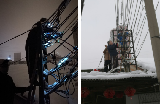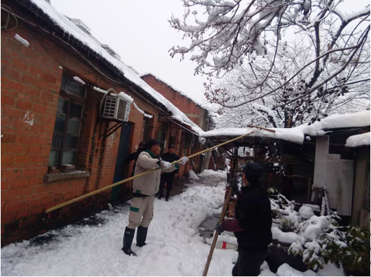 1月4日、5日,合肥地區(qū)普降暴雪,致使公司大院、分公司各生活基地多處老、舊平房100多戶遭受暴雪災襲擊,造成樹枝斷裂壓在房頂上,危及職工住戶生命安全。路口路段出現(xiàn)大面積積雪堆積,交通堵塞,影響居民正常生活出行。面對緊急災情,后勤綜合服務部一是立即成立了除雪保暢、維修應急處置小分隊,合理分工,各負其責。分赴公司大院、二、四分公司生活基地,冒著雨雪搶修高壓電網(wǎng)短路、水管爆裂等災情;二是安排人員張?zhí)┭┨鞖庾龊美吓f房屋、人身安全緊急通知的告示,防患于未然,安全為天;三是與安裝分公司協(xié)助,抽調專業(yè)電工人員幫助消除電網(wǎng)隱患,確保住戶用電安全;四是針對公司大院31棟北側一棵高13米,直徑0.7米的大樹被雪壓倒塌,造成一墻之隔的安紡2村住宅樓第二單元部分損壞和居住安全隱患,后勤及時聯(lián)系專業(yè)樹木砍伐隊伍,對樹木進行分段切割,消除了倒塌樹木對住戶造成的安全隱患,確保了住戶的人身和財產安全。