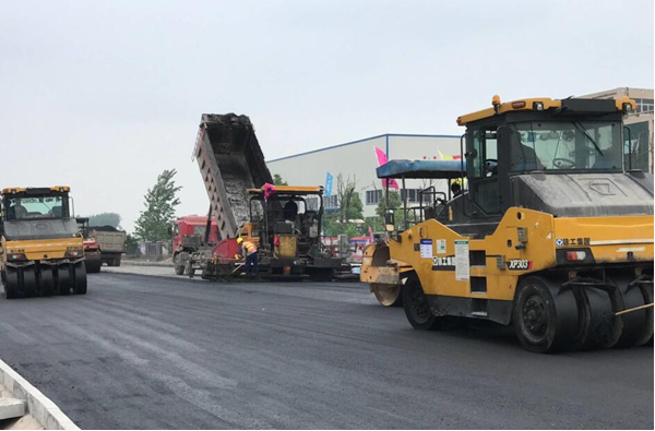 2017年5月3日上午9:58,安徽二建太和市政道路項目現(xiàn)場彩旗飄揚、機器轟鳴,攤鋪機、壓路機、運料車等各種機械設備有條不紊地進行著瀝青路面試驗段施工。