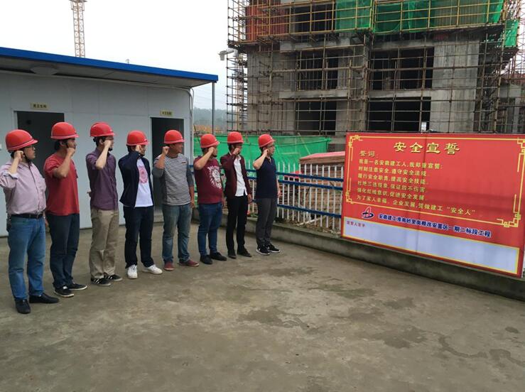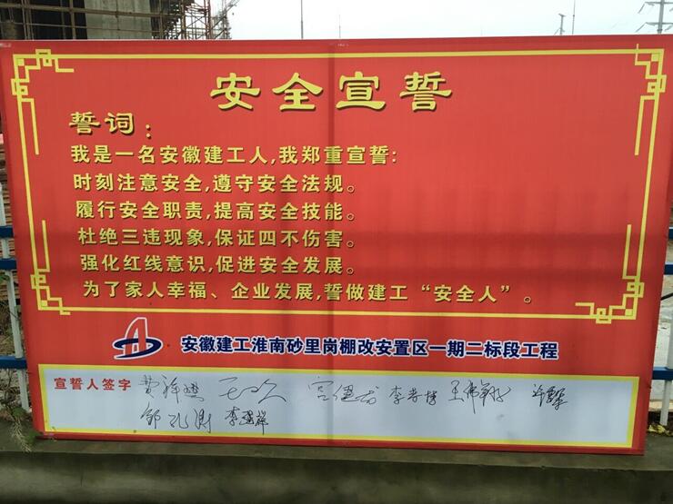 早上六點(diǎn),清晨第一縷陽(yáng)光剛剛灑下,項(xiàng)目部管理人員已在安全宣誓牌前排列整齊,面對(duì)莊嚴(yán)的宣誓牌,全體成員在項(xiàng)目技術(shù)負(fù)責(zé)人王歡的帶領(lǐng)下,右手握拳置于面龐,鄭重地齊聲宣讀誓詞:我是一名安徽建工人,我鄭重宣誓:時(shí)刻注意安全,遵守安全法規(guī);履行安全職責(zé),提高安全技能;杜絕三違現(xiàn)象,保證四不傷害;強(qiáng)化紅線意識(shí),促進(jìn)安全發(fā)展;為了家人幸福,企業(yè)發(fā)展,誓做建工“安全人”。隨后,項(xiàng)目部全體成員在項(xiàng)目經(jīng)理費(fèi)祥琪的帶領(lǐng)下,陸續(xù)在宣誓牌上簽下了自己的名字,表明自己時(shí)刻謹(jǐn)記安全宣誓內(nèi)容,堅(jiān)持安全生產(chǎn)的決心。