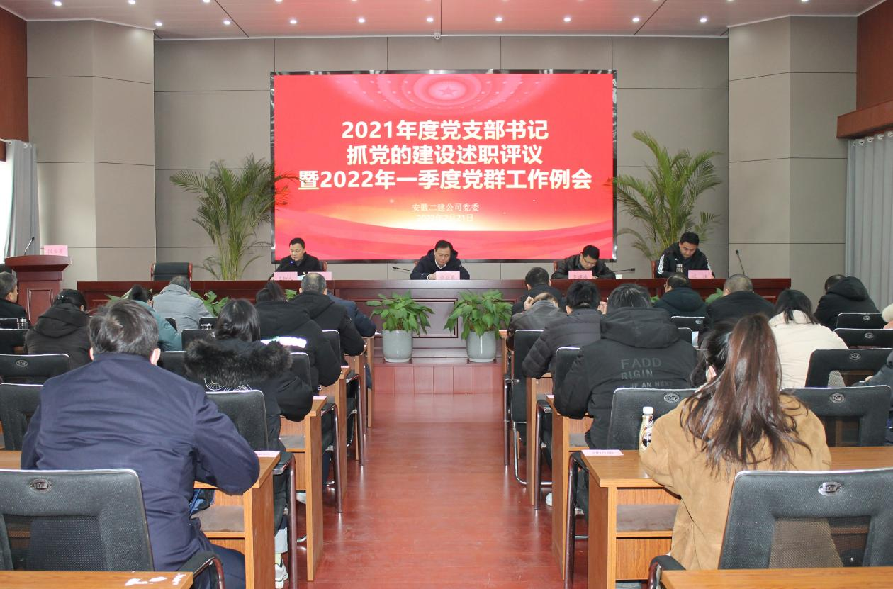 2月21日下午,安徽二建公司在新會(huì)議室召開(kāi)2021年度基層黨支部書(shū)記抓黨的建設(shè)述職評(píng)議暨2022年一季度黨群工作例會(huì)。公司黨委書(shū)記、董事長(zhǎng)許業(yè)勇,黨委副書(shū)記、總經(jīng)理李建成,黨委副書(shū)記、工會(huì)主席王軍,黨委委員、紀(jì)委書(shū)記沈壯出席會(huì)議,公司黨群部門人員、所屬各單位黨支部書(shū)記、團(tuán)支部書(shū)記、綜合辦負(fù)責(zé)黨務(wù)工作人員參會(huì)。會(huì)議由王軍主持。