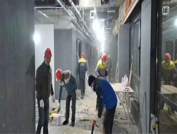 自11月底接到肥東縣委縣政府主要領(lǐng)導(dǎo)指示,公共衛(wèi)生綜合樓須提前交付,投入疫情防控使用。根據(jù)公司搶工動(dòng)員大會(huì)精神,第二分公司、項(xiàng)目部迅速行動(dòng)起來,分公司領(lǐng)導(dǎo)親自指揮,全員行動(dòng),火速調(diào)配勞動(dòng)力、材料物資、機(jī)械設(shè)備等資源力量,投入搶工戰(zhàn)役。一天之內(nèi),編排好詳細(xì)的搶工倒排施工計(jì)劃、實(shí)施方案、保證措施,同時(shí)成立各作戰(zhàn)小組,確保各項(xiàng)任務(wù)如期完成。截止目前,外立面裝飾已完成,除五樓由院方負(fù)責(zé)外,各樓層水電消防橋架暖通空調(diào)智能化等穿線、管道設(shè)備安裝已全部完成,裝飾裝修進(jìn)入到攻堅(jiān)階段。地墻面磚已鋪貼完畢,油漆涂料正在收尾。病房內(nèi)吊頂正在安裝,墻面冰火板已安裝鋪貼50%,pvc地板自流平地坪已完成澆筑,室外道排已完成一半,正在全力沖刺最后目標(biāo)。在搶工同時(shí),質(zhì)量和安全也毫不放松,確?!包S山杯”創(chuàng)建,優(yōu)化工藝,提升質(zhì)量標(biāo)準(zhǔn)。安全檢查日查日報(bào),及時(shí)消除隱患。